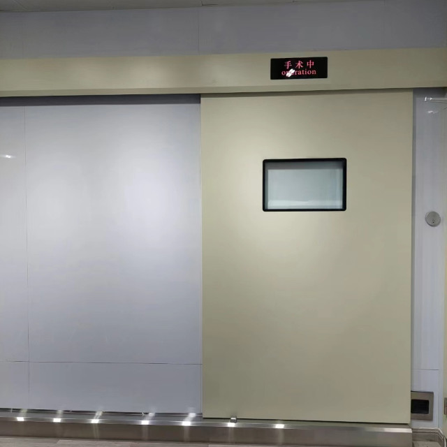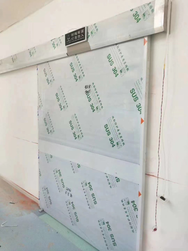 8 醫院防輻射鉛門,門體加貼防輻射標志并在防護門上方加裝指示燈提醒人員注意射線防護!電動推拉防護門可加裝門機聯鎖裝置,防護門關閉不嚴時*機械無法啟動以確保人員安全。